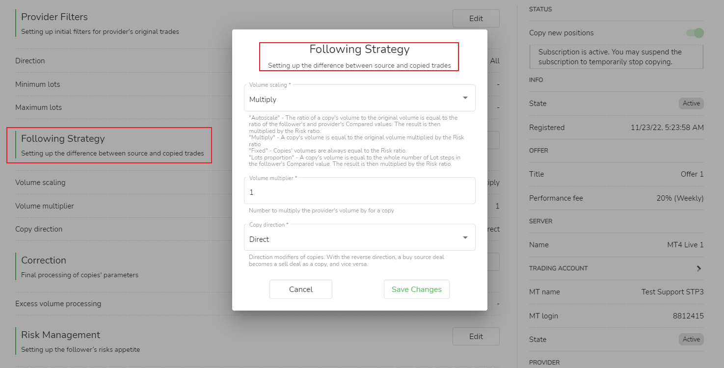 نسبة الرصيد (أو حقوق الملكية) لحساب المتابع إلى الرصيد (أو حقوق الملكية) لحساب مصدر الإشارة يساوي نسبة المركز المتوقع لحساب التابع إلى الموضع الفعلي لحساب مصدر الإشارة ، مضروبًا في مضاعف النسبة الذي حدده حساب المتابع. من خلال مقارنة النسبة بين الرصيد (أو حقوق الملكية) للحساب التالي والرصيد (أو حقوق الملكية) لحساب مصدر الإشارة ، يمكن للمتابع استخدام هذا كنسبة لتحقيق القياس التلقائي وتعديل مركز التداول الخاص به.