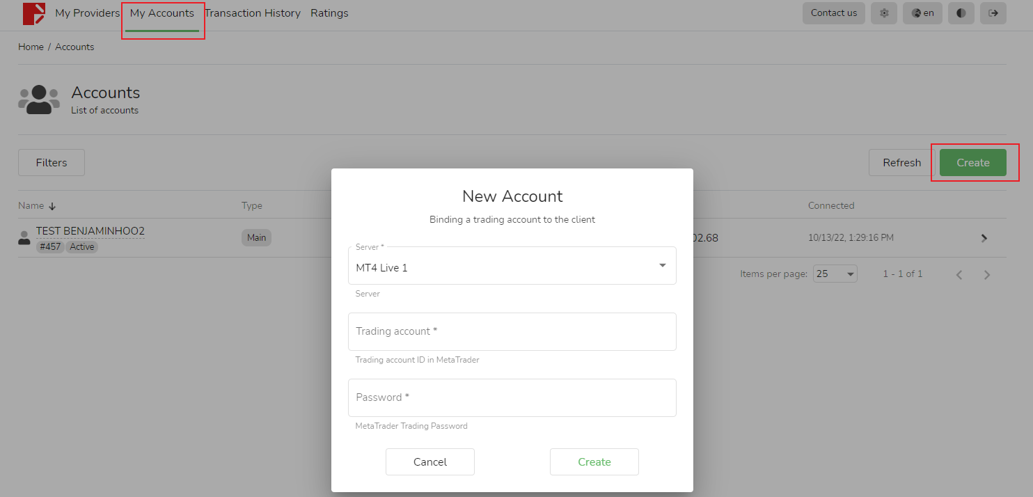 في صفحة المتابع [حسابي] ، يمكنك إضافة حساب تداول جديد بالنقر فوق الزر الأخضر [إنشاء]. ومع ذلك ، لا يمكن استخدام هذا الحساب لتسجيل الدخول ، ويمكن اختياره فقط كمصدر إشارة أو متابع أو إعداد لتلقي رسوم الأداء.