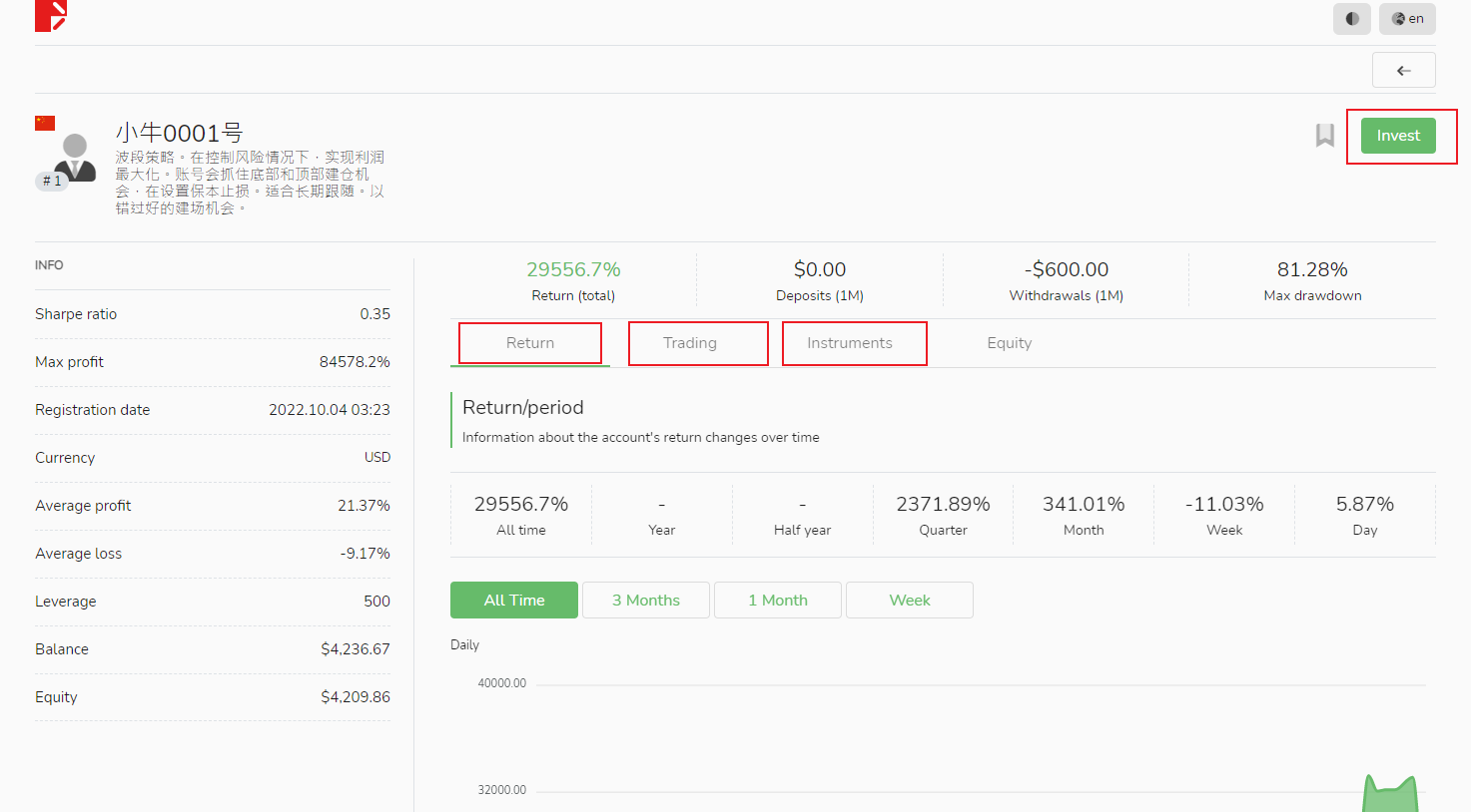 في مربع مصدر الإشارة ، يمكن للمتابعين عرض إحصاءات أداء التداول التفصيلية لكل مصدر إشارة ، مثل معدل العائد ومتوسط المعاملات المربحة ومتوسط سوق التداول وأنواع الاستثمار ، إلخ.