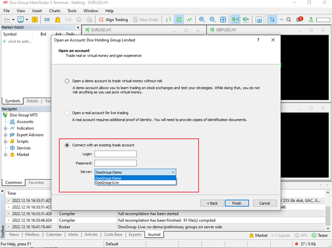 Double-click to open MT5, select [Login to Trading Account] in the top menu bar [File], then search for the specified trading server, and click [Continue]