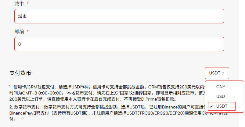 • En la página de pago "nación" Seleccione el país y el estado de la moneda en la que desea pagar y Moneda de pago Seleccione la moneda correspondiente en el menú desplegable (por ejemplo,Año Nuevo Chino).