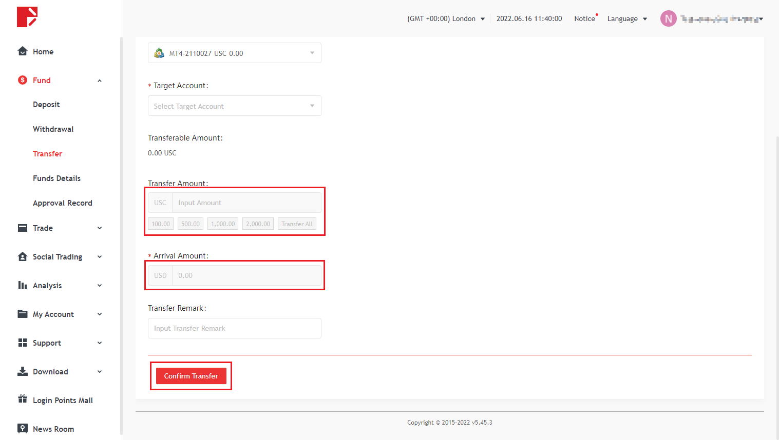 Doo Prime 사용자 센터에 방문하여 홈페이지 왼쪽 열의 "전송"을 클릭하십시오.