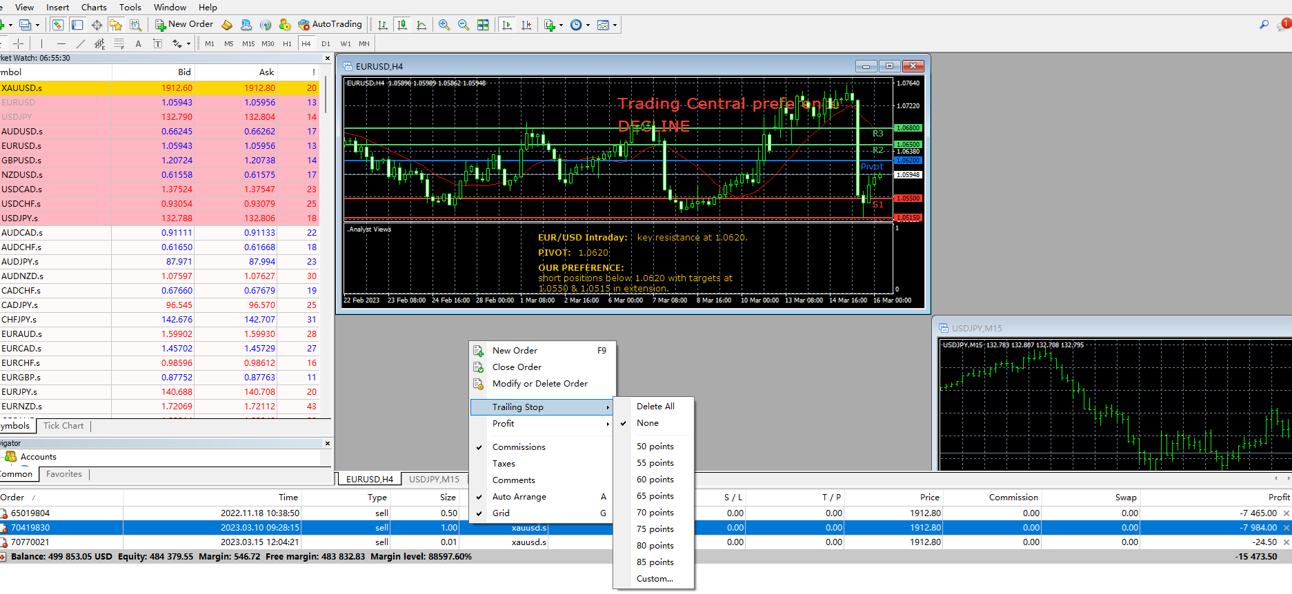 터미널 표시줄에서 "거래"를 클릭하여 기존 주문을 확인한 다음 마우스 오른쪽 버튼을 클릭하여 보유 주문을 선택하고 "추적 손절매"를 클릭한 다음 "사용자 정의"를 선택하고 설정해야 하는 추적 손절매수를 입력하십시오.