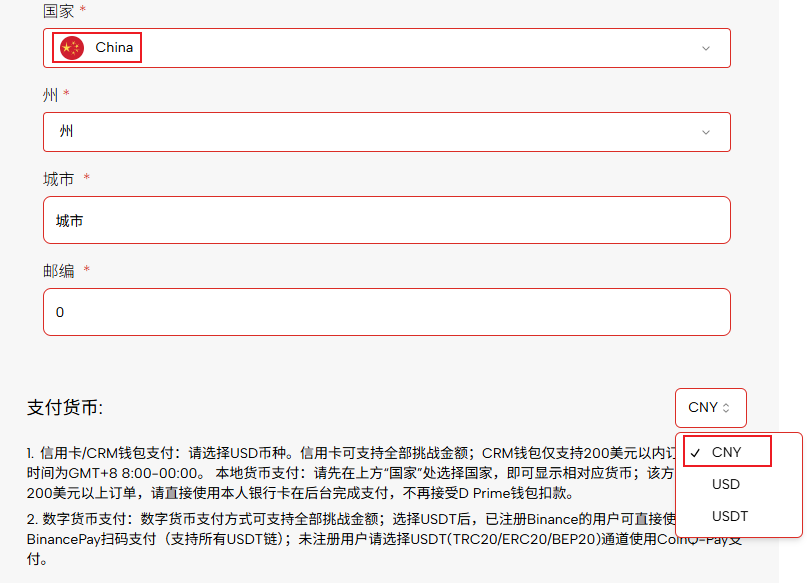 - Na página de pagamento "nação" Selecione o país e o estado da moeda em que deseja pagar e Moeda de pagamento Selecione a moeda correspondente no menu suspenso (por exemploCNY).