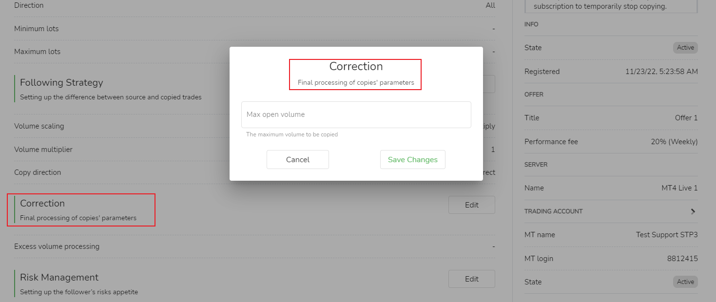 - A correção define a quantidade máxima de negócios copiados que eventualmente serão executados. O seguidor do CopyTrading pode não apenas controlar o risco da posição de negociação da fonte do sinal, mas também controlar o risco do tamanho da posição que deve colocar.