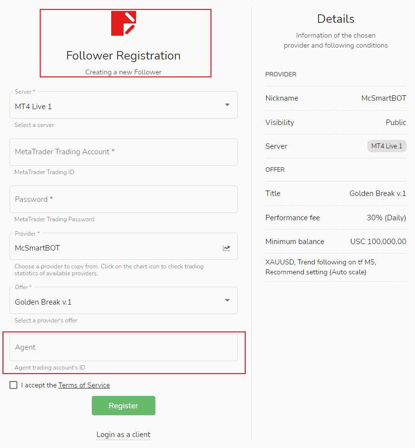Quando o usuário se registra como seguidor, ele só precisa entrar na conta de negociação MetaTrader da promoção de introdução na página de registro para adicionar o promotor de introdução.