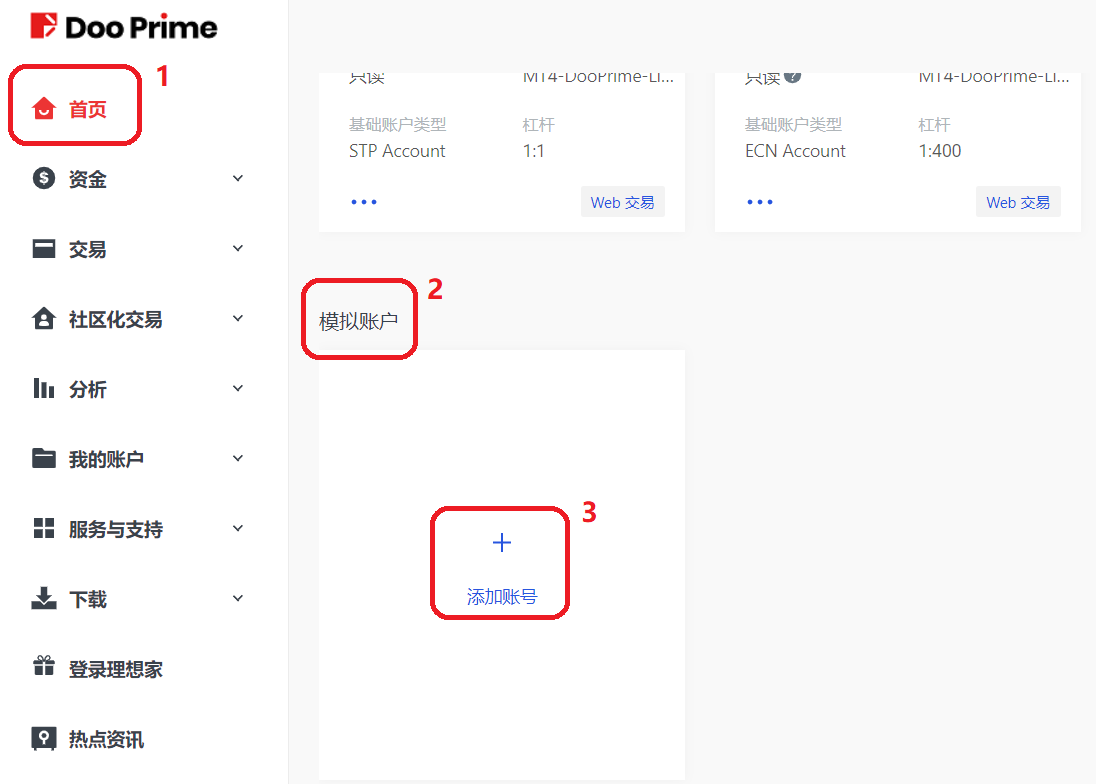 3.1 进入 D Prime 用户中心后,在首页,模拟账户下,选择:添加账号