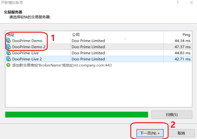 2.1 选择交易服务器 Demo 或者Demo 2,并点击「下一页」。