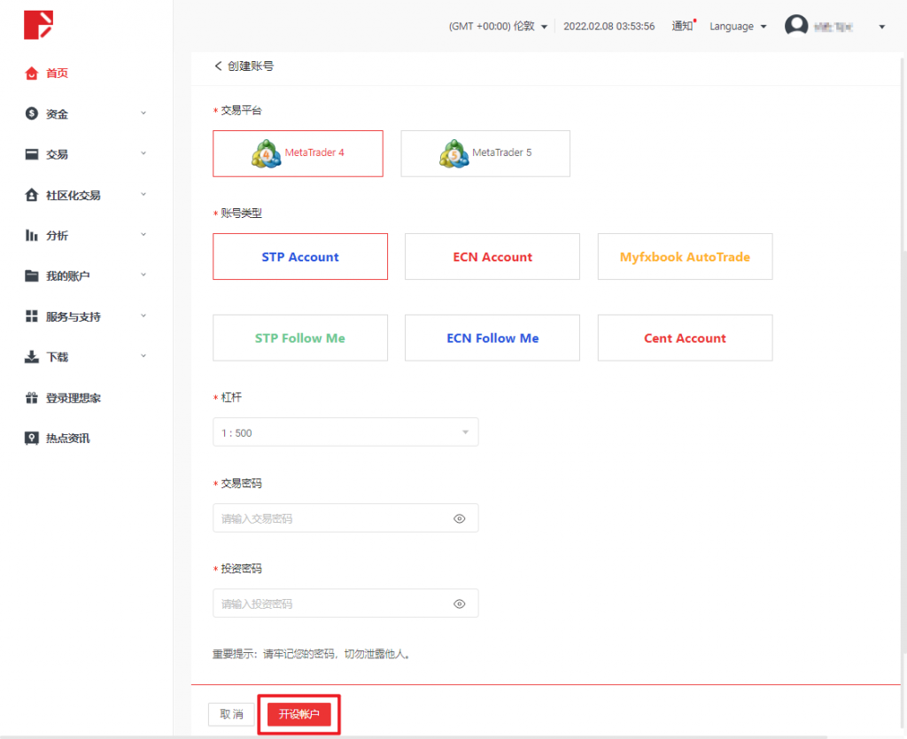請選擇「交易平台」、「帳號類型」及「槓桿」,然後設置「交易密碼」及「投資密碼」,完成後點擊「開設帳戶」。如果您提交的信息無誤,成功註冊的信息便會發送電郵到您的註冊郵箱。
